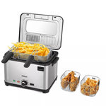 В комплекте три корзины для жарки: одна большая и две малые. Для удобства хранения корзины для жарки имеют съёмные ручки. Две ручки по бокам прибора позволяют легко переносить фритюрницу.