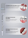 | Особенности: | чистка межзубных промежутков, удаление налета напором воды в дополнение к зубной щетке; соблюдение гигиены при наличии имплантов, брекетов, коронок, мостов; для оздоровления десен с помощью массажа; озонирование воды: дополнительная дезинфекция воды; способствует снятию воспаления с десен |