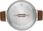 Технология: тройное вштампованное, а затем вплавленное дно без воздушных полостей. Оригинальная конструкция ручек - комбинация стали и бакелита. Преимущества: эргономичная форма ручек; Плоская крышка из термостойкого стекла с паровыпуском и широким металлическим ободом.
