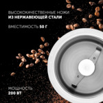 Модель рассчитана на загрузку 50 граммов зерен и оснащена высококачественными ножами из нержавеющей стали. Безопасность работы прибора обеспечивает функция блокировки при снятой крышке. Мощность кофемолки составляет 200 ватт. Имеет импульсный режим работы.